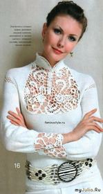 Размер 42-44 Вам потребуется: всего 180 г тонкой акриловой пряжи белого цвета для основного полотна 50 г смесовой пряжи (хлопок/ вискоза) для ажурных деталей; спицы № 2,5 крючок № 1-1,2; крючки для застежки. вязальная машина В этой модели использована техника, имитирующая вышивку «ришелье», с элементами, разработанными автором самостоятельно. Вначале выполните качественную рабочую выкройку и откорректируйте ее по своим меркам, (размеры изделия смотрите на рис. 16. Затем свяжите образец лицевой - на машине, либо спицами и определите плотность полотна. По образцу и лекалу сделайте расчет вязания спинки и полочки. Для спинки наберите расчетное число петель и вяжите лицевой гладью, выполняя и прибавки петель для посадки изделия по фигуре в соответствии с выкройкой. Полочку вяжите аналогично, но с глубоким вырезом для ажурной кокетки. Выполните рукава лицевой гладью до линии а-б. Продолжите работу от а-б «косой» сеткой крючком. Затем приступайте к выполнению крючком ажурной кокетки кофточки. Для чего свяжите цветы по схемам 16 и 16а. Цветы, листья, стебли выполнены на основе 4-х видов кантов, а также комбинированных вариантов, связанных чередованием отрезков выполненных разновысокими столбиками. Порядок выполнения кантов смотрите на рис. 16.1 -16.8. Эскиз композиции кокетки смотрите на рис.16 а Вяжите мотивы и приметывайте их к выкройке кокетки. Свободные пространства заполните цепочками из ВП и С1Н, соединяя мотивы между собой. Разрез под застежку обвяжите по схеме 16 б. Аналогично выполните манжеты кофточки. Готовую кокетку соедините с полочкой, а манжеты - с рукавами. Выполните боковые и плечевые швы, вшейте рукава в проймы. Свяжите воротник лицевой гладью, внешний контур обвяжите по схеме 16 в. Воротник вшейте в горловину. По низу изделия выполните 5 рядов «косой» сеточки, а затем обвяжите кантом из С1Н, прикрепляя его к последнему ряду сетки. На планки застежки пришейте крючки. Схемы вязания крючком деталей кофточки