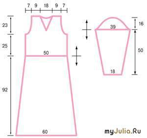 Такой наряд можно связать из шерстяной или хлопчатобумажной пряжи. Для платья понадобятся 1200 г чёрной пряжи, для платка — 200 г чёрной, по 100 г красной и светло-зелёной, по 70 г светло-жёлтой и светло-коричневой и 50 г тёмно-жёлтой пряжи. Кольцевые спицы диаметром 2,5 или 3 мм, крючок диаметром 2,5 мм. ПЛАТЬЕ (размер 46) Вязка. Изнаночная гладь: изнаночными петлями по лицу и лицевыми по изнанке работы. Вкруговую вяжите все петли изнаночными. Отделка крючком: 2 ряда столбиками без накида и 1 ряд «рачьим шагом». Плотность вязки: 17 петель х 26 рядов = 10 х 10 см. ОПИСАНИЕ РАБОТЫ Переднее и заднее полотно. Начните вязать от линии талии вверх. Наберите на спицы вспомогательной нитью 168 петель и провяжите вкруговую 2 ряда. Затем перейдите на основную, чёрную, пряжу и вяжите все петли вкруговую изнаночной гладью. Провязав в длину 25 см, разделите работу на две равные части (по 84 петли на перёд и спинку) и вяжите каждую часть отдельно. Для пройм убавляйте с обеих сторон 1 раз 3, 2 раза 2 и 5 раз 1 петлю в каждом втором ряду. Через 5 см от начала проймы разделите петли переда на две равные части и начните вывязывать V-образный вырез горловины. Для этого каждую часть вяжите отдельно, убавляя с внутреннего края 16 раз 1 петлю в каждом третьем ряду. На 48-м см от линии талии закройте оставшиеся 14 петель плеча в один приём. На спинке для оформления выреза горловины закройте на 45-м см от линии талии средние 14 петель, далее обе части вяжите отдельно, убавляя со стороны горловины 1 раз 5 и 1 раз 4 петли. Оставшиеся на плечи петли закройте на 48-м см. Удалите вспомогательную нить на линии талии, наденьте все петли на кольцевые спицы и вяжите нижнюю часть платья вкруговую изнаночной гладью. Для небольшого расширения прибавляйте в каждой четверти полотна 1 петлю через каждые 10 см. На 92-м см от линии талии закройте все петли. Рукава. Наберите на спицы вспомогательной нитью 66 петель, провяжите 2 ряда, перейдите на чёрную пряжу и вяжите головку рукава снизу вверх изнаночной гладью, убавляя по краям 1 раз 3, 2 раза 2, 11 раз 1 петлю в каждом втором ряду, затем провяжите 4 ряда прямо и ещё убавьте по краям 5 раз 1 петлю. Оставшиеся 20 петель закройте в один приём. Удалите вспомогательную нить, наденьте петли на спицу и далее вяжите сверху вниз, убавляя по краям 18 раз 1 петлю попеременно то в шестом, то в восьмом ряду. Оставшиеся 30 петель закройте в один приём. Сборка. Сшейте плечевые швы. Вставьте рукава в проймы и сшейте рукавные швы. Обвяжите низ рукавов, платья и вырез горловины крючком. ПЛАТОК Вязка. Изнаночная гладь: изнаночными петлями по лицу и лицевыми по изнанке работы. Отделка крючком: 2 ряда столбиками без накида и 1 ряд «рачьим шагом». Филейная сетка: во всех рядах чередуйте 1 столбик с накидом и 1 воздушную петлю. ОПИСАНИЕ РАБОТЫ Платок состоит из 49 квадратов. Свяжите спицами изнаночной гладью 28 квадратов (размером 12 x 12 см) разных цветов: 5 светло-коричневых, 4 светло-жёлтых, 3 тёмно-жёлтых, 8 светло-зелёных и 8 красных. Обвяжите квадраты крючком и вышейте на них узоры. В соответствии со схемой платка между цветными квадратами свяжите крючком филейной сеткой чёрные квадраты (всего их 21) аналогичного размера. По боковым сторонам платка прикрепите к углам квадратов кисти соответствующего цвета. Верхний край платка обвяжите крючком чёрной пряжей, чередуя 1 столбик с накидом и 1 воздушную петлю. УКРАШЕНИЕ Свяжите