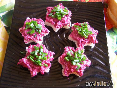 - и придумала! Закуска на ложках " Яйца под шубой" Варёные яйца очистить и порезать попалам , вынуть желтки. Яйца разложить на ложечках. Свёклу очистить, натереть на средней тёрке, кусочек твёрдого сыра тоже потереть на той же тёрке. Желтки раскрошить и выдавить через чеснокодавилку небольшой кусочек чеснока. Немножко посолить и поперчить. Хорошо перемешать. Получился неплохой салатик. Порезать зелёный лук(у меня растёт на окошке ) или петрушку. Можно тонкие кольца репчатого лука.Селёдочку порезать небольшими дольками. Теперь формируем закуску. В яйца выкладываем свекольный салатик. Посыпаем зеленью и кусочек селёдки сверху! Всё, готово! ------------------------------------------------------ Но у меня ещё остался салатик и я слепила закусон "Пять звёзд" Вырезала из хлеба( формочкой для печенюшек )звёздочки. Положила салатик и зелёный лучок.. Вкусняшка! Приятного аппетита! ----------------------- Ещё остались остатки..нужно им тоже применение найти. Рейтинг: +37 Отправить другуСсылка и анонс этого материала будут отправлены вашему другу по электронной почте. |