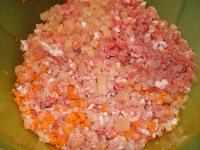 Взяла 800 гр. куриной грудки и грамм 200 свиной шейки, среднюю морковку, 3 зубчика чеснока. Большую часть мяса перемолола на мясорубке с морковью и чесноком, остальное мясо очень мелко нарезала