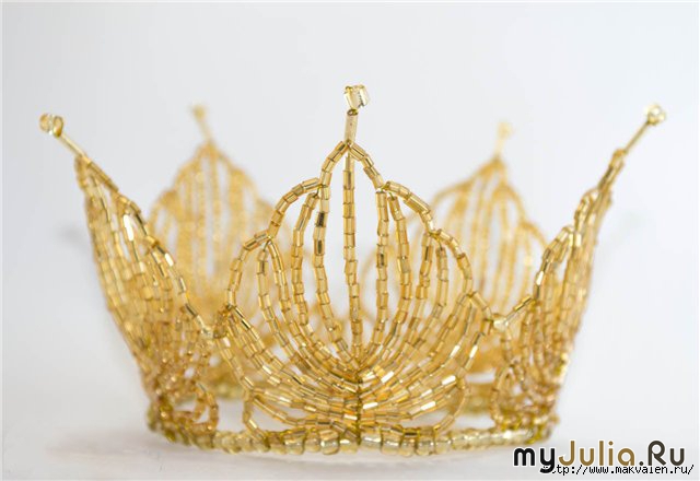 Из золотистого бисера и проволоки мы сплетем такую корону, что ей позавидует даже королева. Материалы: - рубка золотого цвета 35 гр - бисер №6 золотого цвета 5 гр - стеклярус золотой 5 шт - проволока золотая толщина 0,3 мм - проволока медная толщина 1 мм - плоскогубцы и кусачки Шаг 1 Работу начинаем с ободка. Возьмите медную проволоку 1 мм, оденьте на нее бисер №6 и закрутите концы. Ободок не большой, не намного больше обычной крышки от банки