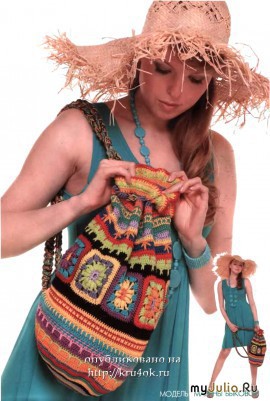 Яркая жизнерадостная сумочка обязательно пригодится вам на отдыхе. Она подойдет к любым шортам, юбкам или брюкам. Вам потребуется: 350 гр х/б ниток разных цветов (125 м/ 50 гр), крючки № 2 и №8. Для того чтобы связать такой рюкзачок Вам потребуется проявить свою фантазию. Совсем не обязательно копировать эту вещь. Здесь важен принцип и идея, а все остальное зависит только от Вас. Вам пригодятся как новые мотки, так и разные остатки ниток. Важно только, чтобы все они имели прочную окраску и были одинаковой толщины. Начните работу с подбора цветового сочетания 8-ми квадратных мотивов. Для этого отрежьте от каждою мотка по 1.5-2 см ниток и разложите их на отдельных белых бумажных полосках по 4 цвета. Закрепите нитки прозрачным «скотчем», отметьте направление вязания. Теперь подберите сочетание будущих квадратов между собой. Свяжите квадраты по схеме. Сшейте их иглой контрастной нитью за обе полупетли в кольцо. Этой же ниткой обвяжите столбиками с накидом одну сторону кольца. Длина окружности кольца равна окружности донышка. Свяжите донышко рюкзачка следующим образом: 3 ВП замкните в кольцо; в центр кольца 6СБН, далее вяжите СБН по кругу, делая по 6 прибавок а каждом ряду до нужного размера, чередуя цветные полосы по своему желанию. Последний ряд донышка выполните С1Н, далее 1 ряд провяжите рельефными изнаночными столбиками (у Вас получится бортик). Теперь вяжите по кругу без прибавок прямыми и обратными рядами СБН, С1Н или С2Н, чередуя цвета и делая петли для подъема. Для получения рисунка: «галочка» введите крючок на 1 или 2 ряда ниже; «крестик» — на 2 ряда ниже спереди вокруг С1Н; «звездочки» — сделайте 5 проколов 1, 2-мя. 3-мя рядами ниже на полосе из СБН и провяжите все петли с крючка в 1 прием. Свяжите нижнюю часть рюкзачка (10-15 см). В начале и конце одного из первых рядов сделайте отверстие из 2-3-х ВП для закрепления лямок. Пришейте кольцо из квадратов. Затем продолжите вязание от верхнего края кольца цветом, которым обвязан нижний край. Свяжите еще 20-25 см. В верхней части свяжите 1 ряд СЗН + 12 отверстий из 1ВП для продержки ручки. Свяжите еще 5-6 рядов и обвяжите край «рачьим шагом». Ручку свяжите шнуром «гусеничка» в 6-7 нитей разных цветов крючком №8. Вставьте ручку в оставленные сверху отверстия, концы лямок заправьте в отверстия нижней части рюкзачка и закрепите их с изнаночной стороны. При желании можно пришить подкладку.