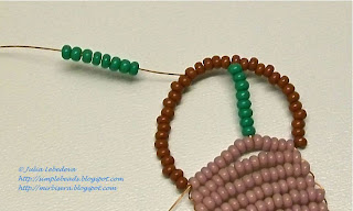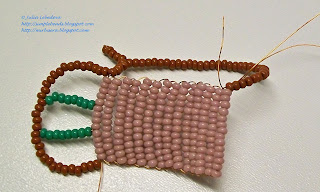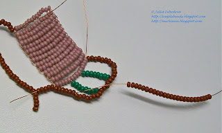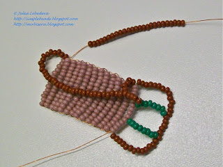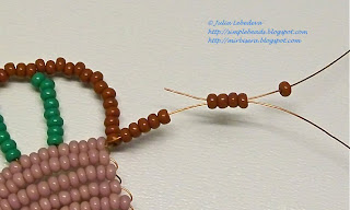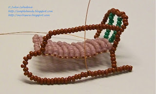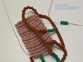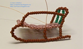 Для того, чтобы к Новому году сделать упряжку Деда Мороза, сегодня будем делать сани. Нам потребуется: - бисер № 8; я взяла бисер трёх цветов: розово-серого, коричневого и зелёного; - проволока диаметром 0,3 мм. Сани будем делать на основе техники плетения кресла-качалки, описанной вот в этом мастер-классе. Поскольку разница в технике изготовления санок и кресла-качалки очень невелика, я буду описывать последовательность плетения санок более упрощённо, предполагая, что при необходимости Вы можете посмотреть более подробное описание этой техники в мастер-классе по креслу-качалке. Приступаем к плетению. Берём проволоку длиной 170 см и сначала делаем сиденье санок, используя для этого технику параллельного плетения. Сиденье состоит из 14 рядов, в каждом из которых по 14 бисеринок. Причём первый ряд бисеринок размещаем не на середине проволоки, а немного в стороне от неё, чтобы один из концов проволоки был примерно на 15 см длиннее другого. Я сплела сиденье из розово-серого бисера. Далее делаем спинку санок. Выбираем более длинный конец проволоки и набираем на него 33 коричневые бисеринки, после чего пропускаем этот конец проволоки через первые 9 бисеринок последнего ряда сиденья с противоположной стороны Вытягиваем этот конец проволоки и набираем на него 8 зелёных бисеринок Далее пропускаем этот конец проволоки через 5 бисеринок, находящихся точно посередине спинки санок. Вытягиваем этот конец проволоки и опять набираем на него 8 зелёных бисеринок Далее пропускаем этот конец проволоки через бисеринки последнего ряда сиденья с 6-ой по 14-ую по счёту, считая с того конца, из которого выходит второй конец проволоки Вытягиваем проволоку - спинка санок готова. Переходим к изготовлению боковых ограждений и полозьев. Сначала делаем их с одной стороны санок. Набираем на один из концов проволоки 10 коричневых бисеринок. Придерживаем последнюю набранную бисеринку и пропускаем этот конец проволоки в обратном направлении через соседние с ней 4 бисеринки. Придвигаем все бисеринки вплотную к изделию и затягиваем проволоку. Затем набираем на этот же конец проволоки ещё 35 коричневых бисеринок и, ведя этот конец проволоки из-под низа сиденья, пропускаем его между 1-ым и 2-ым рядами сиденья. Вытягиваем этот конец проволоки так, чтобы последние набранные бисеринки упёрлись в сиденье, и делаем этим концом проволоки оборот вокруг каркаса сиденья между 1-ым и 2-ым рядами Далее набираем на этот же конец проволоки 25 коричневых бисеринок и, ведя проволоку сверху вниз, пропускаем этот конец проволоки сначала через 6 коричневых бисеринок внешней части спинки, примыкающих к сиденью, а затем сразу же - через 5 коричневых бисеринок, составляющих вертикальную опору между сиденьем и полозом санок. Вытягиваем этот конец проволоки до упора и пропускаем его через 8 ближайших бисеринок полоза санок по направлению к передней части санок. Далее набираем на этот конец проволоки 5 коричневых бисеринок и, ведя проволоку снизу вверх, пропускаем её между 9-ым и 10-ым рядами сиденья. Затем набираем на этот же конец проволоки 5 зелёных бисеринок и пропускаем проволоку через бисеринки бокового ограждения с 12-ой по 19-ую по счёту, считая от спинки по направлению к передней части санок. Далее набираем на этот конец проволоки 4 зелёные бисеринки и, ведя проволоку сверху вниз, пропускаем её ме