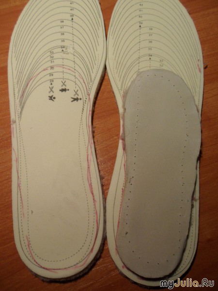 Но, мы пока не бегаем, а больше сидим в санках, и размер обувки большой - поэтому чтобы ножки не мерзли меняем стельки. Выковыриваем заводские стельки Отделяем их от специальной картонки В магазине покупаем термостельки универсального размера. Прикладываем старые стельки (но не картонки!) и обводим по контуру. Вырезаем и простыми стежками пришиваем к картонкам Вот и всё. Готовые стельки по размеру чуть больше картонки - когда вставим их в валенки, мягкая подошва загнется вверх и закроет внутренние обувные стыки. А теперь, на прогулку!