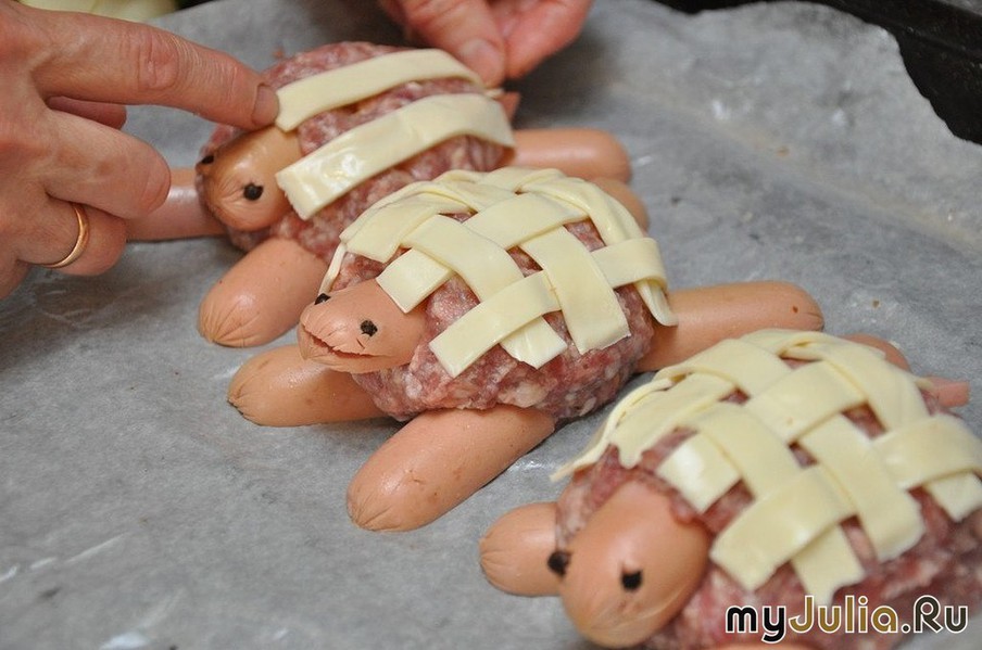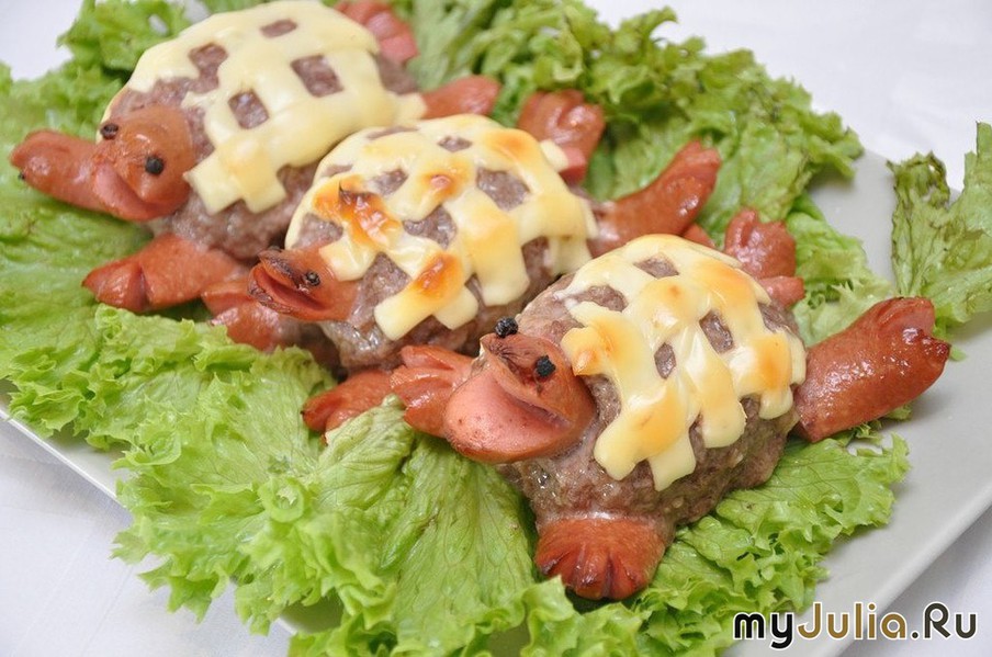 ИНГРЕДИЕНТЫ: 300-400 г мясного котлетного фарша, 5 детских сосисок, сыр бутербродный в пластинках, соль,перец, несколько штук гвоздики или горошин черного перца для украшения, листья салата для подачи. Сосиску разрезаем вдоль на две половинки, затем поперек. С одной стороны делаем ножом два надреза. Получается четыре «лапки». То же проделываем еще с двумя сосисками. Оставшиеся сосиски разрезаем на три части: концы сосисок – это «головки» двух черепашек, а середина – «хвостики». На каждой «головке» делаем горизонтальный надрез – это будущий «ротик». Фарш солим и перчим, формируем котлеты. Втыкаем в них «лапки», «хвостик», «головку», из гвоздики или горошин перца делаем глазки. Переходим к панцирю. Пластинки сыра нарезаем полосками и в виде сеточки выкладываем на котлету – «спинку» черепашек. Ставим наши котлеты в духовку 180° С на 30-35 минут. Как только сыр начнет запекаться, накрываем котлеты фольгой. Минут за 5 до конца запекания фольгу снимаем, чтобы дать сыру подрумяниться. Горячие котлетки Черепашки выкладываем на зелень и сразу подаем к столу. Приятного аппетита! рецепт взят из инета, но мне он понравился ) Рейтинг: +11 Отправить другуСсылка и анонс этого материала будут отправлены вашему другу по электронной почте. |