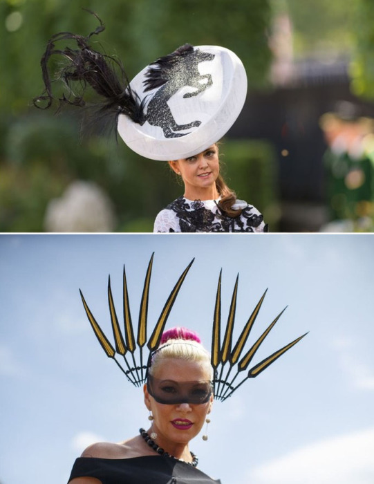 Вообще в Аскоте редко можно увидеть классические скромные шляпки-таблетки. Традиционно головные уборы выглядят как целые скульптурные композиции и поражают воображение своей оригинальностью. Например, в этом году дизайнеры соорудили для прекрасных дам шляпы с гигантскими цветами, крыльями бабочки и лошадьми.