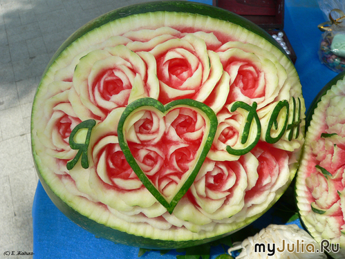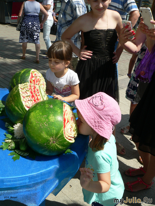 Я давно уже как-то уж очень критично отношусь к своим работам, а тут арбузик так понравился, что я ему прямо ночью фотосессию устроила: И утром продолжила: Села второй арбузик резать, а тут вдруг раз - мэр уже рядом. Откуда только взялся? И подошел так тихо, без всяких там барабанов и цоканья гвардейцев Говорит: «Можно арбуз забрать?» Поднимаю глаза, а это мэр , стоит пальцем арбуз ковыряет. Я арбуз забрать разрешила и на автомате дальше резать принялась, как-то не оценила серьезности ситуации, а фотокоры и операторы как засуетились, давай затворами щелками, камеры на меня наставлять… Не совпали мы, в общем. Может, мэр и обиделся на мое «негостеприимство»… Когда я в следующий раз подняла голову, его уже рядом не было.Фотки с мэром пока нет. Если позже найду где-нибудь, добавлю. Вырезание шло по плану, получилось, как задумывала. Арбуз с цветочком: И арбуз с надписью: Ну а потом всё было тихо-мирно, народ активно фотографировал и фотографировался, делал селфи и не-селфи, снимались даже с недорезанным арбузом. Детишки порадовали, Они арбузы с удовольствием нюхали ![]() Все, подобно мэру, норовили потрогать арбуз, а потом радостно сообщали окружающим: «Они настоящие!» Рейтинг: +17 Отправить другуСсылка и анонс этого материала будут отправлены вашему другу по электронной почте. |