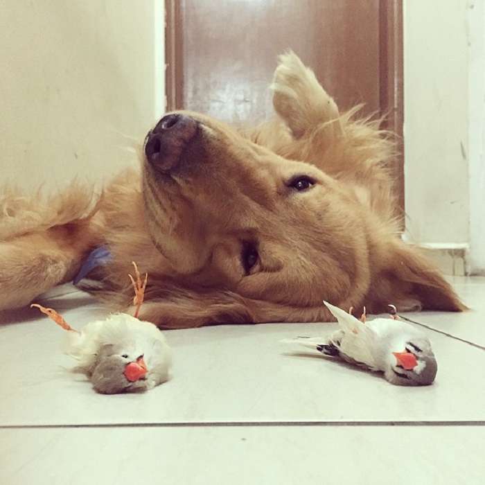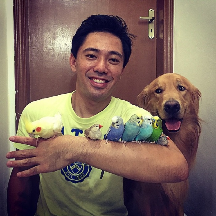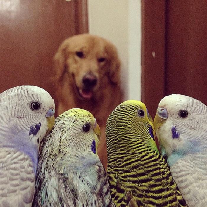 Дружелюбный золотистый ретривер Боб из Бразилии любит декоративных птиц не меньше, чем его хозяин. Милый пёс привлёк внимание после того, как в Instagram появились его фото. Во такая собачья жизнь в окружении восьми пернатых. 1. Очень необычная компания