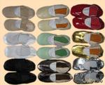 Обычно для подошвы используется кожа, а для верхней части применяется винил: для мальчиков — черного цвета, а для девочек — белого.
