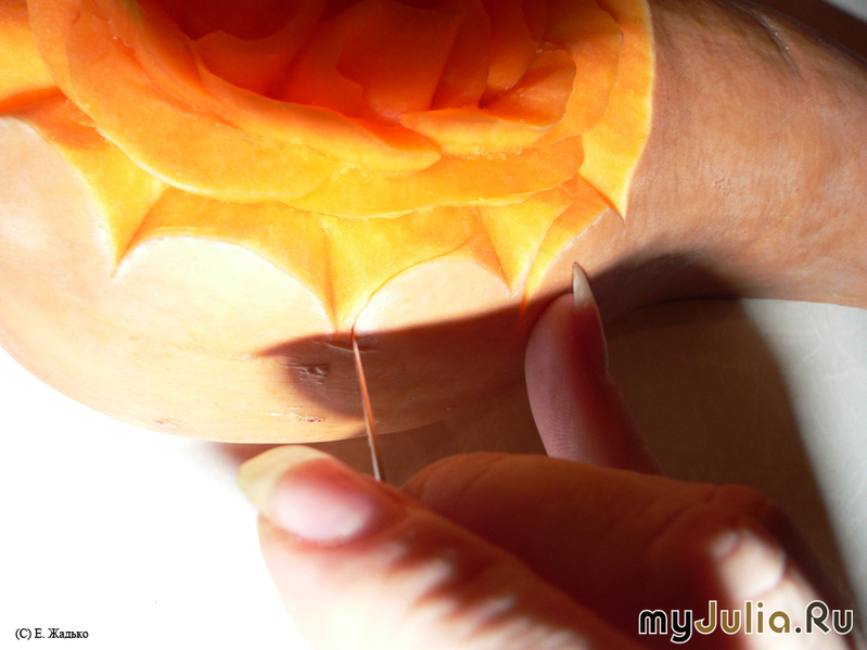 1. Сначала нужно сформировать площадки под листики - в виде полукруга. Диаметр выбирайте сами, в зависимости от творческой задумки. 2. Начиная от правого верхнего угла площадки прорезаем плавную волнистую линию, держа нож под углом 60 градусов. 3. Подрезаем мякоть под срезом, держа нож под углом 45-30 градусов. Линия среза должна быть такой же плавной и изогнутой, как первый срез. 4. Слева от среза сверху вниз прорезаем линию, продлевая кончик листика. 5. Немного отступаем вверху от последнего среза и вырезаем треугольник, приводя нож к концу предыдущего среза. 6. Листик уже "видно": 7. Возвращаемся к основной части листика. Добавим рельефа: Если не умеете вырезать зубчики, этот пункт можно пропустить. 8. Ведя нож под углом 60 градусов, начиная сверху, прорезаем плавную волнистую линию к кончику листика. 9. Подрезаем мякоть, повторяя линию: и убираем лишнее: 10. Вот такие листики получается в итоге: Это база, на ее основе можно сделать множество разных листиков, изменяя их длину и ширину, добавляя рельефы или делая их гладкими. Можно к одному кончику сводить несколько линий. Я в свой узор включила еще вариант листика с центральной жилкой: Ну а в общем тыковка получилась вот такой: Рейтинг: +13 Отправить другуСсылка и анонс этого материала будут отправлены вашему другу по электронной почте. |