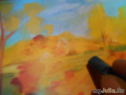 1. Наносим контур рисунка тоненькой карандашной линией. И прокрываем основные плоскости размытой акварельной краской. Можно использовать и яркие, насыщенные цвета, но в этом случае они будут сильно просвечивать через пастель, и будет невозможно добиться богатства гаммы оттенков. Хотя если задумана работа очень яркая, контрастная, то можно сразу прокрывать ярким цветом. Акварель полностью должна высохнуть. Для работы пастелью понадобится чашка с водой (если вы работаете не рядом с раковиной) и салфетка, чтобы вытирать пальцы. Руки должны быть чистыми и сухими. Если кожа рук жирная и склонна к потливости - вымыть руки особенно тщательно с мылом, при необходимости протереть чем-нибудь обезжиривающим, иначе жирные пятна останутся на мелках и испортят их. 2. Начинаем поверху писать пастелью. Сначала - светлые тона. Поскольку пастель можно перекрывать только темным поверх светлого. Если делать наоборот, темное будет проступать, смешиваться со светлым, приглушать цвет. И светлый тон, положенный поверх темного никогда не будет таким ярким и светящимся, как положенный поверх бумаги или акварельной подкладки. Пастель не рекомендуется смешивать. Смешивание цветов допустимо лишь на границе пятен, а вообще пастелью пишут в основном чистым цветом - именно для этого в наборе столько разных оттенков. На фото мелок без гильзы, но вообще это неправильно. Новая пастель уже заправлена в гильзы, предохраняющие пальцы от случайного загрязнения. Если таких гильз нет, можно завернуть мелки в фольгу. Если Вы пишете, держа руку не на весу, а кладете ее ребром ладони на лист, то подложите под нее листок бумаги, чтобы рукой на размазывать то, что уже нарисовали. Пастель, и вообще все мелковые техники - то единственное исключение, когда рисунок можно и нужно растирать пальцем (в карандашном рисунке это недопустимо). Самая распространенная ошибка при работе пастелью - растирать новый цвет тем же пальцем, которым растирали предыдущий. Это приводит к грязным пятнам. Растирать нужно каждый раз другим пальцем. То есть, вы можете подряд размазывать пальцем только пять цветов. Если одинаково работаете обеими руками - то десять.