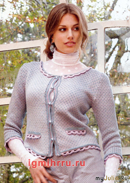 ЭЛЕГАНТНЫЙ ЖАКЕТ ИЗ ДВУХЦВЕТНОГО УЗОРА И С ОТДЕЛКОЙ КРЮЧКОМ. Вязание спицами и крючком