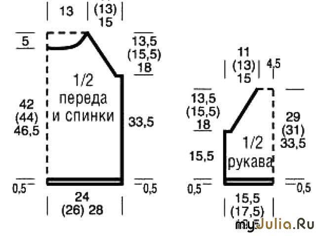 Перед: вязать, как спинку, но с горловиной. Для этого через 42 см = 180 рядов (44 см = 190 рядов) 46,5 см = 200 рядов от планки закрыть средние 23 (24) 25 п. и обе стороны закончить раздельно. Для скругления по внутреннему краю закрыть в каждом 2-м ряду 3 х 3 п., 2 х 2 п. и 5 х 1 п. На высоте спинки закрыть оставшиеся 4 п., они относятся к горловине. Рукава: набрать на спицы для каждого рукава по 81 (92) 103 петли и для планки связать 0,5 см = 3 ряда платочной вязкой, при этом начать с 1 изнаночного ряда. Продолжить работу ажурным узором. Через 15,5 см = 66 рядов от планки выполнить регланный скос, как на спинке. Через 29 см = 124 ряда (31 см = 134 ряда) 33,5 см = 144 ряда от планки оставшиеся 23 (24) 25 п. оставить. Сборка: выполнить швы реглана, а также швы рукавов и боковые швы. Набрать на круговые спицы оставленные петли правого рукава, спинки и левого рукава, по краю горловины переда набрать еще 71 (72) 73 петли = 184 (18 192 п.