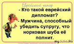 Современная Одесса. Еврей-парикмахер во время работы постоянно говорит с клиентом о политике. Хозяин парикмахерской замечает: — Абрам Моисеевич, зачем вы с клиентом разговариваете о политике? — Как — таки зачем? Я ему рассказываю наши ужасы — у него волосы встают дыбом. И мне легче стричь. Ночь. Рабинович из командировки заканчивает телефонный разговор с женой. — Ну все Сара, целую! Спи с Богом. — Не слышу, Зяма! — Я говорю: иди, спи с Богом. — С кем спи? Я не слышу! — Говорю по буквам: Борис, Олег, Гоша, Олег, Мойша. — Зямочка, я все поняла, но почему с Олегом два раза? Он шо, твой начальник? В магазине — Дайте мне пару банок сардин. — Вам какие: испанские, португальские или марокканские? — Какая мине разница! Я же с ними не разговаривать собралась! - Здравствуйте, я налоговый инспектор, хотел бы поговорить с Рабиновичем. - Его нет. - Как нет? Я его минуту назад в окно видел! - Он вас тоже... ![]() — Фима, как ты думаешь, в раю мужчины живут отдельно от женщин? — Безусловно, Сарочка… Иначе какой же это рай?! Из переписки Всегда надейтесь на Чудо и купите себе невод или на худой конец - удочку!