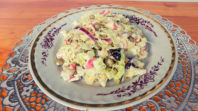 Крабовый салат с капустой и консервированным горошком. Видео рецепт