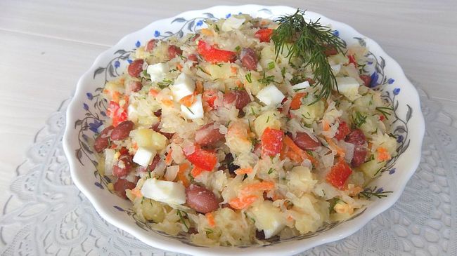 Продукты для приготовления овощного салата: • 600 гр. квашеной капусты • 1 банка консервированной фасоли (400 гр.) • 4-5 картошин • 3 куриных яйца • 1 репчатый лук • Немного болгарского перца (при желании) • Зелень укропа • Соль по вкусу • Подсолнечное нерафинированное масло 1. Для начала сварим в подсоленной воде яйца и картофель. Даем остыть и почистив нарезаем небольшими кубиками. 2. Мелко нарезаем репчатый лук и мелко нашинкуем зелень укропа. Можете добавить в этот овощной салат любую зелень на Ваш вкус. 3. Я в этот салат еще добавляю немного мелко нарезанного небольшими полосками сладкого красного болгарского перца. 4. У меня квашеная капуста собственного приготовления. Я ее решила измельчить немного поменьше. 5. Смешиваем все нарезанные продукты в салатнике. Добавляем консервированную фасоль слив из нее всю жидкость. Я в этом салате использую красную консервированную фасоль. Вы же можете использовать и белую консервированную фасоль - это уже на Ваш выбор и вкус. 6. Солим салат из квашеной капусты по своему вкусу и я заправляю его подсолнечным ароматным нерафинированным маслом. 7. Нам осталось только хорошо перемешать все продукты в салате и можно подавать его на стол. Мой видео рецепт квашеной капусты Рейтинг: +2 Отправить другуСсылка и анонс этого материала будут отправлены вашему другу по электронной почте. Последние читатели: |