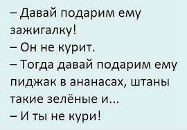 — Скоро вы сможете читать без очков. — Да как же это я буду читать без очков, если я и с очками-то не очень? — Пальцами, мой дорогой, пальцами! — Ковид прекратится, когда будет 90% вакцинированных. — А мы не будем прививаться! — Дорогой дружок, 90% можно достичь не только за счёт числителя, но и за счёт знаменателя. Взрослая жизнь — это на приеме врача слушать, что тебе назначили, и думать про себя «так, ну эту херню я пить не буду, эту тоже, эту надо погуглить». — Доктор вам удалось спасти мою ногу? — Да, конечно, вон она, в банке с формалином стоит. Я вот, например, только на самокате езжу... Экономично, для здоровья полезно, припарковываюсь где угодно... Одна только "фигня" - правая нога теперь длиннее... — Доктор, у меня почему-то зубы пожелтели… — Так осень же... Вакцинированные могут заболеть, но не тяжело и умирают легче. Я выбираю ЗДОРОВУЮ пищу... Поэтому на ужин у меня сегодня огурчики, грибочки, картошечка и ЗДОРОВАЯ бутылка водки... — У вас есть справка о психическом здоровье? — К сожалению, нет. По пути сюда марсиане отобрали. Петрович пил только медицинский спирт и закусывал докторской колбасой, но здоровье почему—то становилось все хуже и хуже. Объявление:Человек, который вчера потерял бумажник — знай, семь тостов было за твоё здоровье! Два психиатра встречаются на симпозиуме. — Какой у вас был самый трудный случай в практике? — интересуется один у другого. — Был у меня пациент, который жил в мире иллюзий, — отвечает его коллега. — Он верил, что страшно богатый дядюшка в Южной Америке собирается оставить ему состояние. Все дни напролет ждал письма от мифического адвоката. Никуда не выходил из дому и ничего не делал. — И каков результат лечения? — Я боролся восемь лет за его душевное здоровье и в конце концов вылечил его... А потом пришло это дурацкое письмо... Пришёл мужик к психиатру: — Доктор, у меня всё плохо: здоровья нет, денег нет, никто меня не любит. — Ну, сейчас мы быстренько поправим! Садитесь поудобнее, закрывайте глаза и повторяйте за мной:— У меня всё хорошо. Я здоров, богат и благополучен. Я люблю и любим. Мужик открывает глаза: — Я рад за вас, доктор. Но мне—то чё делать?! Учёным—медикам так до сих пор и не удалось выяснить, что вреднее для человеческого здоровья:— Тараканы в голове или камни в почках. Осень, холодно, сыро. Заходит в рюмочную оборванный, окоченевший алкаш и просит налить опохмелиться. Буфетчица жалеет его: — Вы бы себе хоть ботинки новые купили. — На хрена, здоровье дороже! Иногда настроение удаётся улучшить только за счёт нанесения вреда здоровью. Жена осужденного обратилась к начальнику тюрьмы ввиду плохого здоровья мужа давать ему самую легкую работу. — Куда ж легче? Он клеит бумажные конверты! — говорит начальник. — Я очень рада, а то муж говорит, что ему приходится по ночам копать какой—то туннель! Разговор профессора и молодого лаборанта. — Профессор, вы как человек опытный, ответьте мне, когда начинается старость? — Старость, юноша, начинается тогда, когда на сохранение здоровья, вы начинаете тратить больше, чем на его разрушение. — Как вы думаете, какой гроб лучше купить? — Трудно сказать, — отвечает продавец.— Цинковые, конечно, долговечнее, однако деревянные полезнее для здоровья.