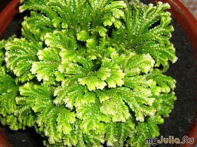 Селагинелла, или Плаунок (Selaginella) - единственный род травянистых споровых растений из семейства Селагинелловые (Selaginellaceae). Род включает свыше 300 видовтравянистых растений самых разных форм. Среди них есть стелющиеся и лазящие разновидности, некоторые похожие на увеличенный в несколько раз мох или кустики небольшого папоротника.В природе селагинелла встречается на всех континентах, за исключением самых холодных климатических зон. Около двадцати видов используют как комнатные декоративные растения, все они теплолюбивые и происходят из тропиков, поэтому при уходе в домашних условиях обязательно следует это учитывать. В естественных условиях эти разновидности селагинеллы растут во влажных лесах, могут жить на стволах деревьев или в расщелинах как эпифиты, легко переносят длинные периоды тропических дождей. Считается, что селагинеллу выращивать трудно. Это не совсем так. Основная проблема – она не любит сухого воздуха. Если влажность в доме нормальная, то этого вполне достаточно. При пониженной влажности лучшим вариантом будет использование селагинеллы для создания флорариума – композиции в стеклянном сосуде. Хорошими компаньонами для нее будут другие влаголюбивые растения – тилландсии, папоротник пеллея, криптантусы. ПОПУЛЯРНЫЕ ВИДЫ СЕЛАГИНЕЛЛЫ Селагинелла Мартенса (Selaginella martensii)встречается в цветочных магазинах чаще всего. Это компактный кустик 15-25 см высотой. Стебли молодых растений прямостоячие, с возрастом они становятся полегающими, от них отходят многочисленные воздушные корни. Листья мелкие, двухрядные, плотно прилегают к побегу, глянцевые или матовые. Цвет листьев – зеленый различных оттенков, особенно ценятся разновидности с серебристо-белыми или желтоватыми кончиками стеблей. Селагинелла безножковая (Selaginella apoda) – небольшое растение с ползучими стеблями и мелкими листочками. Образует мохообразные дернистые подушечки. Выращивается как ампельное растение. Селагинелла крючковатая (Selaginella uncinata)- ампельное растение небольших размеров, отличается голубоватым оттенком листьев. Селагинелла Крауса (Selaginella kraussiana) – изящное растение, ценится за интересную особенность – ее побеги на концах приобретают желто-зеленый цвет. Селагинелла чешуелистная (Selaginella lepidophylla) больше известна под названием «воскресающее растение» или «иерихонская роза». При низкой влажности ее стебли и листья скручиваются и теряют свой цвет, растение выглядит совсем засохшим бурым комком. Однако выбрасывать кустик не стоит – при поливе и содержании при повышенной влажности эта селагинелла возрождается, ее побеги разворачиваются и листья приобретают свежий зеленый оттенок. Селагинелла Крауса (Selaginella kraussiana) – изящное растение, ценится за интересную особенность – ее побеги на концах приобретают желто-зеленый цвет. СОВЕТЫ ПО УХОДУ ЗА СЕЛАГИНЕЛЛОЙ Температура. Все известные у нас виды селагинеллы теплолюбивые. Не переносят холодных сквозняков. Оптимальная температура летом около 20-23 градусов, зимой – нениже 18 °С. В сильную жару растение лучше убрать с подоконника и перенести в самое прохладное место. Влажность. Для успешного выращивания требуется повышенная влажность, желательно не ниже 60% . Полезны регулярные опрыскивания. Рекомендуется выращивание селагинеллы в "бутылочном садике" или флорариуме. Освещение. Теневыносливое растение, 