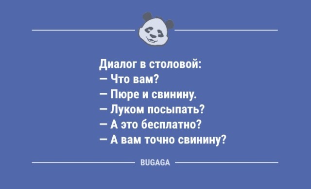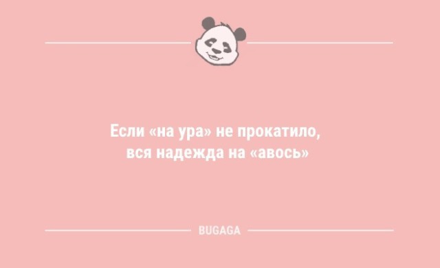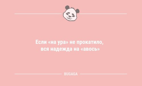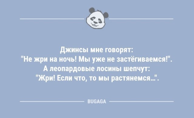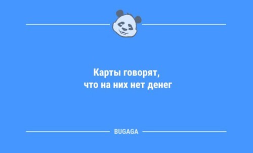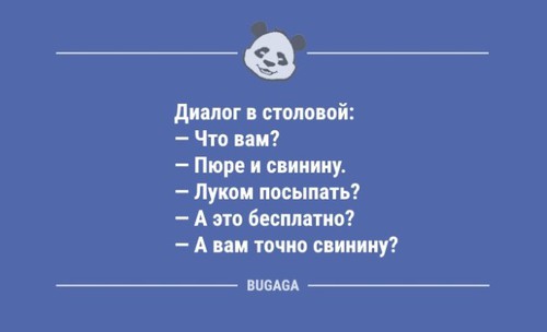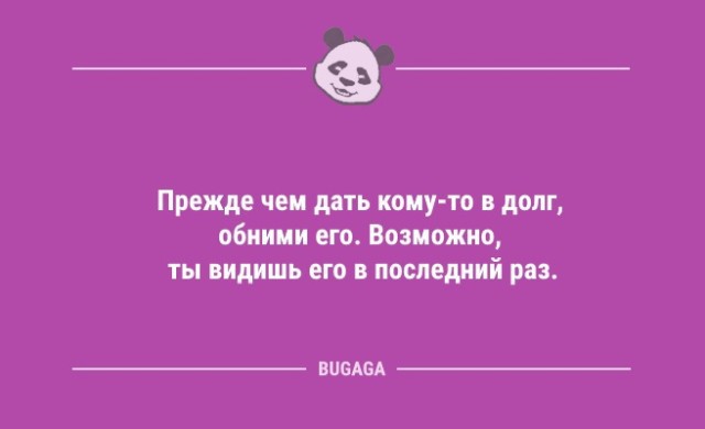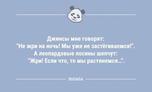 - А у вас есть точно такая же, но поменьше размером?- Ты самый ужасный зять, которого я когда-либо видела. Успех - единственный непростительный грех по отношению к своему ближнему. Одна сказала: По крайней мере мой сын никогда не скажет вашим дочерям, что его мама готовила вкуснее. - Прими мои искренние поздравления, мой мальчик. Я уверен, что сегодняшний день останется у тебя в памяти, как самый счастливый день в твоей жизни! - Но, ведь свадьба завтра, папа! - Я знаю, что говорю! Очень неприятно видеть мужика, которого ты бросила, живым. Хоть бы спился, что ли, для приличия. Никакого уважения, ей богу! Когда смотришь последнюю серию любимого сериала, внутри случается маленькая смерть. В новостях сказали, что ожидается большой снегопад и все, кто собирается в дорогу в такую погоду, должны иметь с собой: цепи, лопату, одеяло, обогреватель, буксировочный трос, фонарик, запасное колесо Сегодня в трамвае я выглядел, мягко говоря, странно... Сказка про Золушку говорит о том, что любой девушке главное продержаться красивой до полуночи. Ну, а там как повезёт. - А почему иногда пишут «Л. Толстой», а иногда «А. Толстой»? - Ну Лёша и Алексей, кому как нравится.. Раньше как было хорошо: пригласил девушку на бал, убил ее мужа на дуэли, и порядок - это твоя девушка. А теперь лайки ставить, музыку скидывать, ужас! Я пользуюсь той самой модной диетой, когда ты ешь всё подряд и надеешься на чудо. По ночам мой организм вырабатывает мощнейший универсальный усилитель вкуса. Бог разговаривает с Адамом: - Адам, ну тебе что одного ребра жалко? - Жалко… не жалко… Но просто у меня плохое предчувствие по поводу твоего предложения… Женщины заставляют нас, мужчин, идти на безумные поступки! Например, менять постельное белье! Я уже сегодня чувствую, как устану завтра... Если после свидания она добавила вашу совместную фотку в сторис, это ещё не значит, что ты ей нравишься. Это вообще не для тебя. Это для бывшего. Во всем надо видеть плюсы, вот, допустим, с твоими жирными боками ты никогда не провалишься в канализационный люк. Рейтинг: +1 Отправить другуСсылка и анонс этого материала будут отправлены вашему другу по электронной почте. Последние читатели: