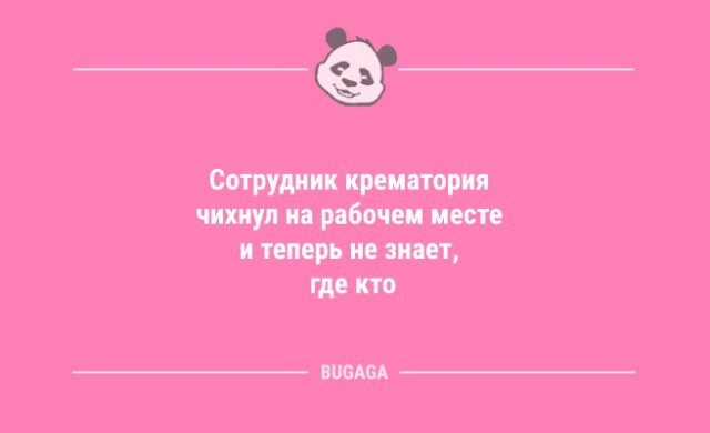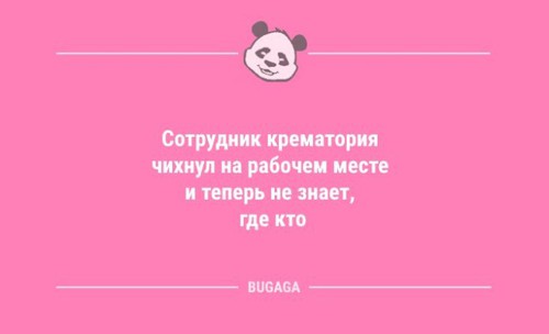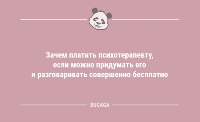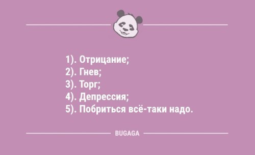 Раньше каждый день все офигевали, как тормозит американский президент.Теперь все в шоке, как он гонит... Оптимисты при слове билет думают о путешествии, а пессимисты - про экзамен. Нет ничего тяжелее, чем две минуты смотреть на чужом телефоне видео, и изображать неподдельный интерес. Люди такие: "Я ничего не успеваю, в сутках недостаточно времени!", а потом идут гладить постельное бельё. Не всякий мужчина пойдет в ресторан с женщиной, одетой в красное вечернее платье с глубоким вырезом. Скорее он пригласит особу в скромном, неброском наряде. И весь вечер будет глазеть на женщину в красном вечернем платье с глубоким вырезом. "Как пройти пять километров". Пошаговая инструкция. Юмор должен покидать человека, как капитан свой корабль, последним! Пчелы не тратят время на мух, объясняя им, что мед лучше г*вна. И вы не тратьте. Как взбесить жену: 1. Сесть вместе с ней на диету из солидарности. 2. Ты худеешь - она нет. 3. Готово. Решили с женой начать всё сначала. Так она даже на свидание не пришла… Вся моя жизнь заключается в том, что я заношу в квартиру пакеты с продуктами, а выношу с мусором. Не стоит говорить правду, если можно соврать - козыри надо беречь. - Тебе не кажется, что я поправилась? - Милая, ты никогда и не была худенькой. Время смерти 16:05. Причина смерти: коронавирус. Жена - мужу: - И не говори мне, что ты ночевал у своих друзей! Я ночевала у твоих друзей - тебя там не было! Сообщения о том, что образованные люди переводят мошенникам крупные суммы денег лишний раз напоминают, что образование ума не прибавляет. Интернет научил меня многому. Например, тратить время, которого у меня нет, и ненавидеть людей, которых я никогда не встречала. Оказывается, если иногда отдыхать, то все не такие уж и сволочи. Это гениальные люди, когда им на голову падает яблоко открывают гравитацию, практичные люди изобретают каску! Рейтинг: +1 Отправить другуСсылка и анонс этого материала будут отправлены вашему другу по электронной почте. Последние читатели: